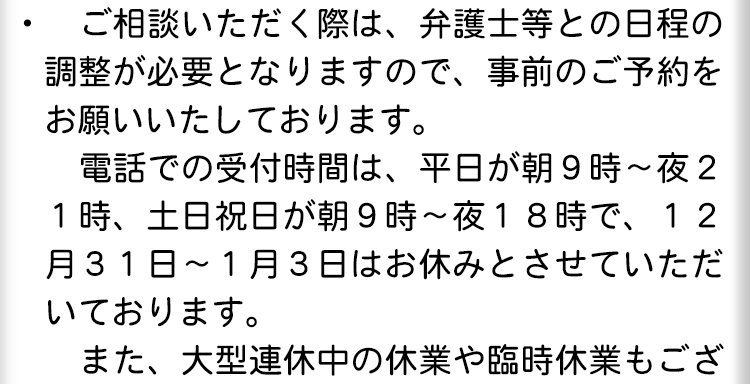 当法人へのご相談の際は、まずはフリーダイヤルやメールフォームにてお問い合わせください。ご予約により夜間や土日祝日のご相談にも対応いたします。