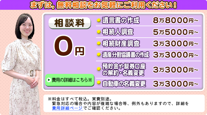 相続手続きについて相談する場合は原則として費用がかかりませんので、より気軽にご利用いただけるかと思います。まずはお気軽にご連絡ください。