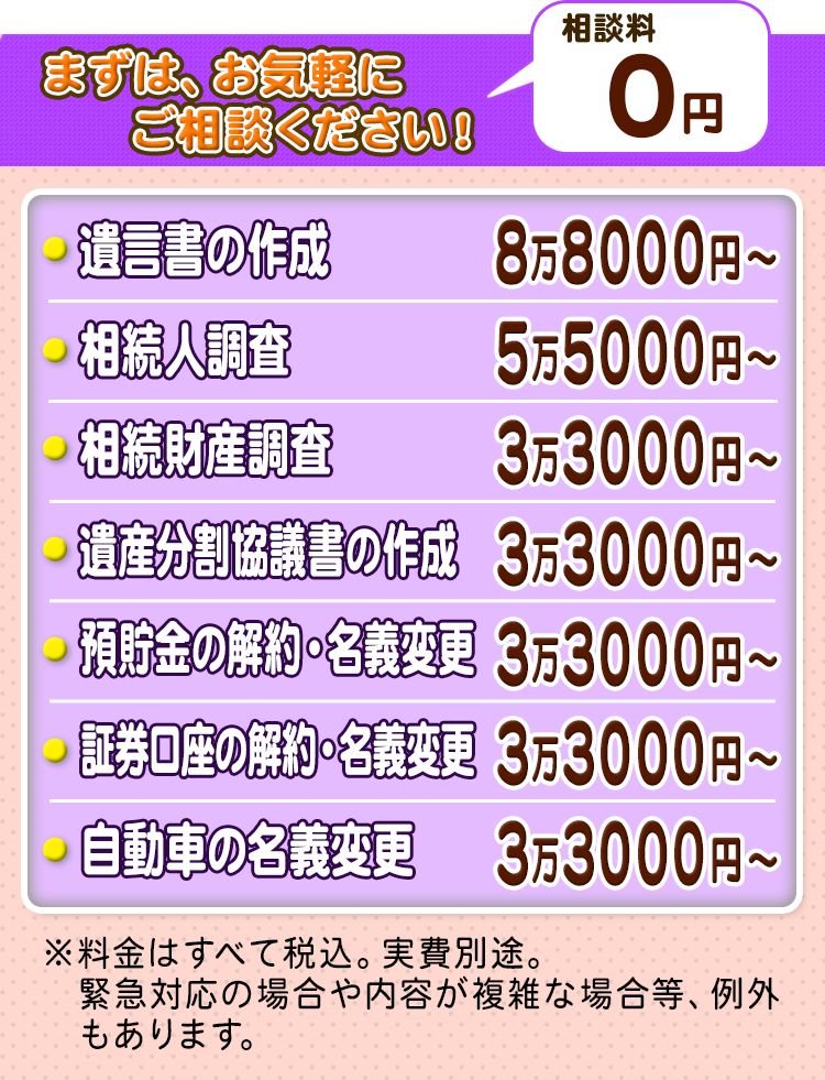 当法人では、相続手続きのご相談を原則無料で承ります。