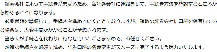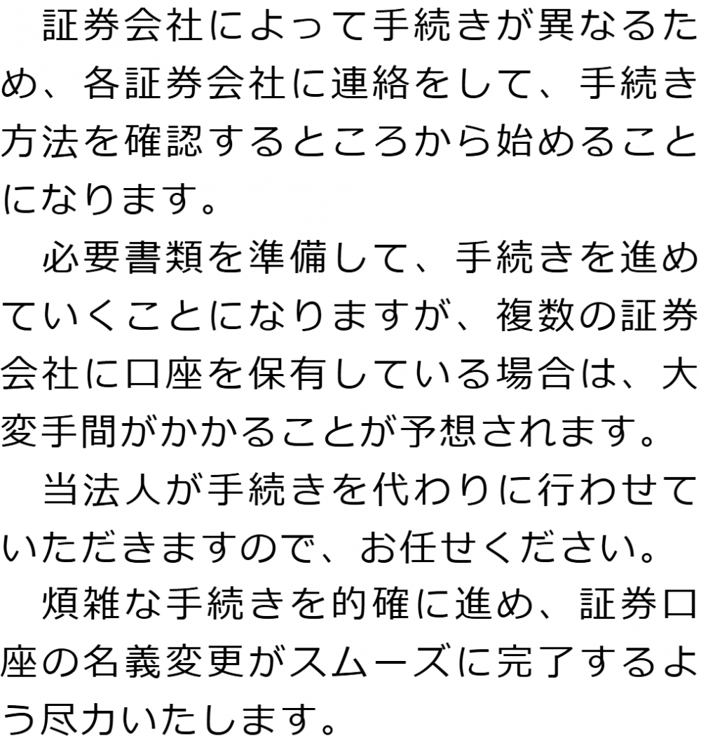 トップ業務内容証券口座の解約・名義変更 階層構造▼ 業務内容(目次) 証券口座の解約・名義変更 業務内容(目次)業務内容トップ行政書士法人心の業務内容遺言遺産整理相続人調査相続財産調査遺産分割協議書の作成預金・貯金の解約・名義変更証券口座の解約・名義変更自動車の名義変更心グループのその他の業務内容家族信託・民事信託節税対策事業承継遺言の検認相続放棄限定承認遺産分割遺留分侵害額請求相続登記相続税申告相続税調査 受付時間 平日 9時~21時、土日祝 9時~18時 夜間・土日祝の相談も対応します (要予約) 所在地 〒530-0001 大阪府大阪市北区梅田1-1-3大阪駅前第3ビル30F 0120-2403-39 お問合せ・アクセス・地図