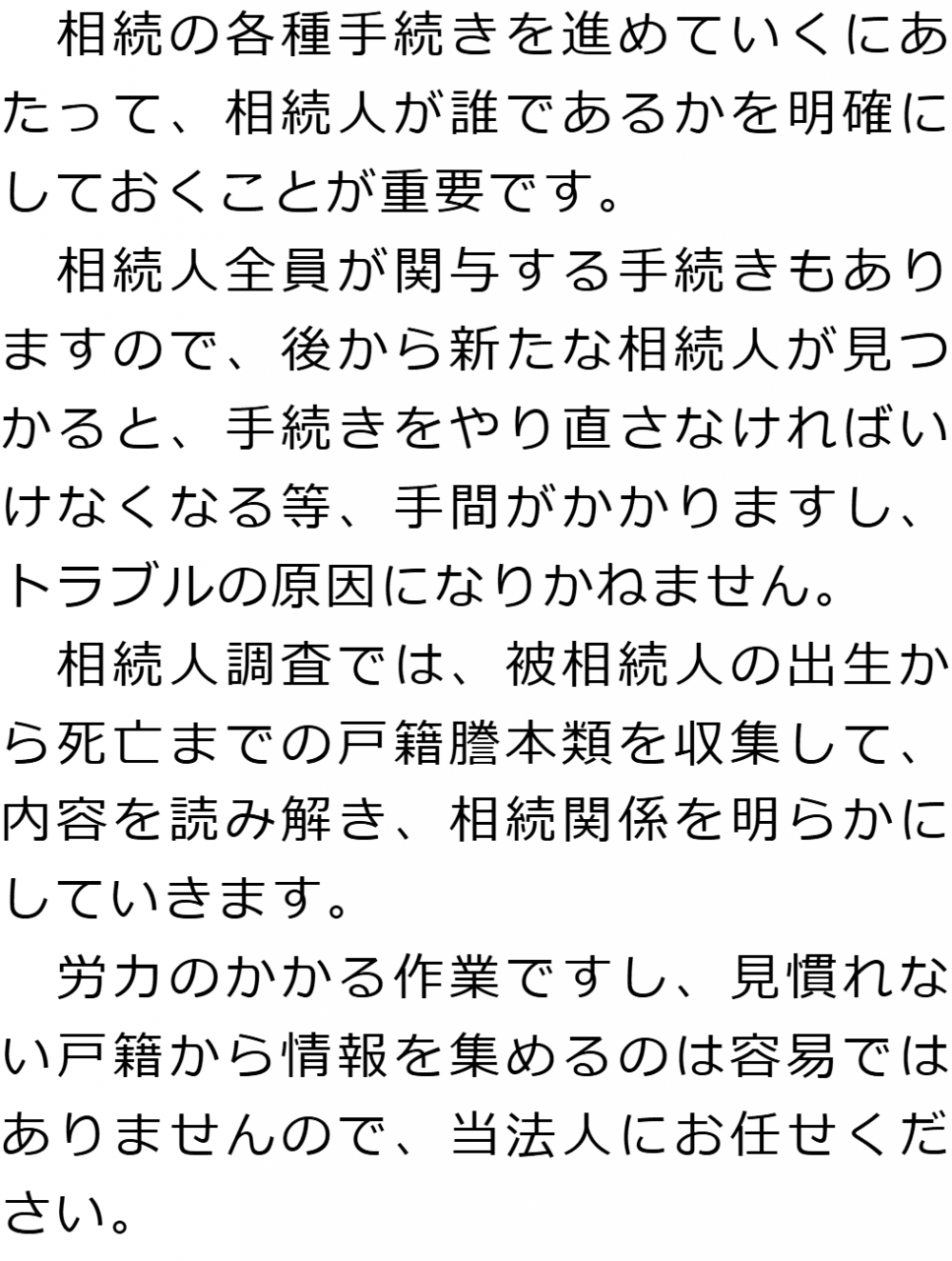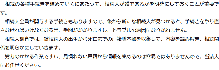 トップ業務内容相続人調査 階層構造▼ 業務内容(目次) 相続人調査 業務内容(目次)業務内容トップ行政書士法人心の業務内容遺言遺産整理相続人調査相続財産調査遺産分割協議書の作成預金・貯金の解約・名義変更証券口座の解約・名義変更自動車の名義変更心グループのその他の業務内容家族信託・民事信託節税対策事業承継遺言の検認相続放棄限定承認遺産分割遺留分侵害額請求相続登記相続税申告相続税調査 受付時間 平日 9時~21時、土日祝 9時~18時 夜間・土日祝の相談も対応します (要予約) 所在地 〒530-0001 大阪府大阪市北区梅田1-1-3大阪駅前第3ビル30F 0120-2403-39 お問合せ・アクセス・地図