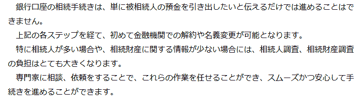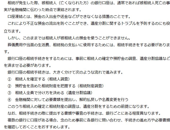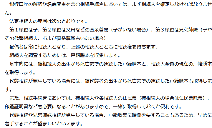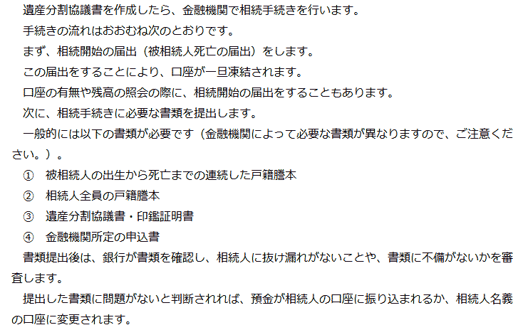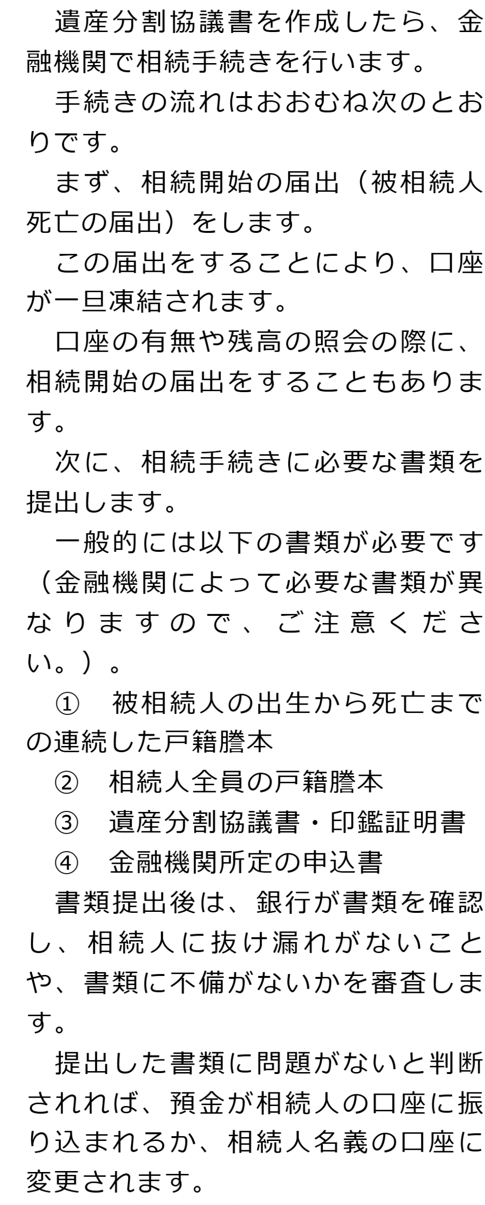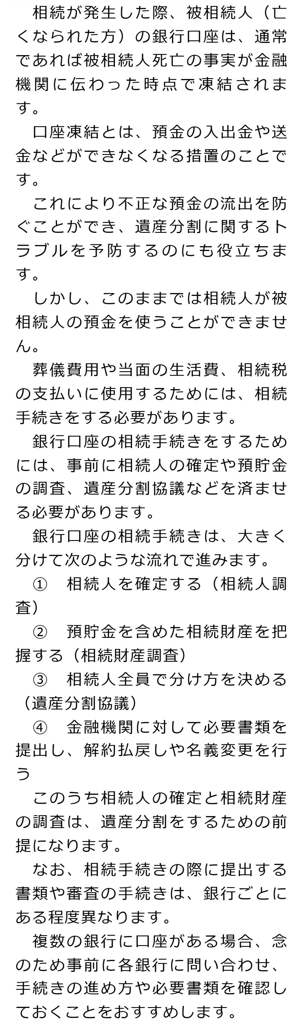 1 銀行口座の相続手続きの概要 2 相続人を確定する(相続人調査) 3 預貯金を含めた相続財産を把握する(相続財産調査) 4 相続人全員で分け方を決める(遺産分割協議) 5 金融機関における預貯金の解約・名義変更 6 相続手続きは専門家に相談・依頼することをおすすめします