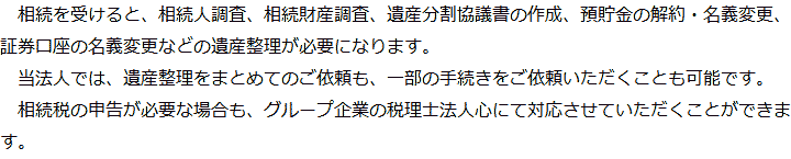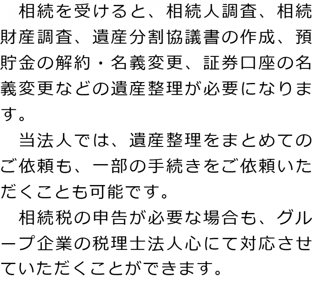 トップ業務内容遺産整理 階層構造▼ 業務内容(目次) 遺産整理 業務内容(目次)業務内容トップ行政書士法人心の業務内容遺言遺産整理相続人調査相続財産調査遺産分割協議書の作成預金・貯金の解約・名義変更証券口座の解約・名義変更自動車の名義変更心グループのその他の業務内容家族信託・民事信託節税対策事業承継遺言の検認相続放棄限定承認遺産分割遺留分侵害額請求相続登記相続税申告相続税調査 受付時間 平日 9時~21時、土日祝 9時~18時 夜間・土日祝の相談も対応します (要予約) 所在地 〒530-0001 大阪府大阪市北区梅田1-1-3大阪駅前第3ビル30F 0120-2403-39 お問合せ・アクセス・地図