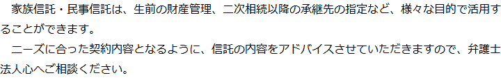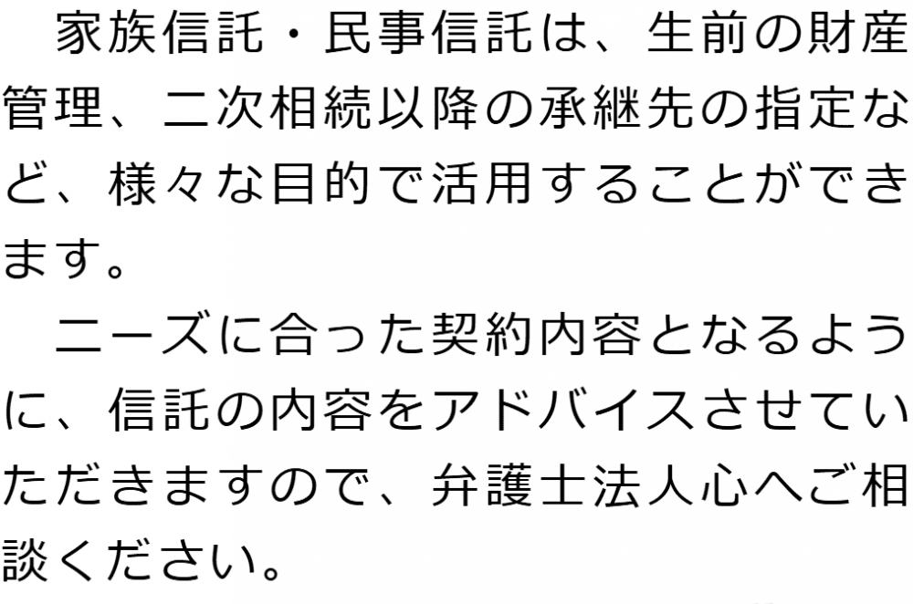 トップ業務内容家族信託・民事信託 階層構造▼ 業務内容(目次) 家族信託・民事信託 業務内容(目次)業務内容トップ行政書士法人心の業務内容遺言遺産整理相続人調査相続財産調査遺産分割協議書の作成預金・貯金の解約・名義変更証券口座の解約・名義変更自動車の名義変更心グループのその他の業務内容家族信託・民事信託節税対策事業承継遺言の検認相続放棄限定承認遺産分割遺留分侵害額請求相続登記相続税申告相続税調査 受付時間 平日 9時~21時、土日祝 9時~18時 夜間・土日祝の相談も対応します (要予約) 所在地 〒530-0001 大阪府大阪市北区梅田1-1-3大阪駅前第3ビル30F 0120-2403-39 お問合せ・アクセス・地図