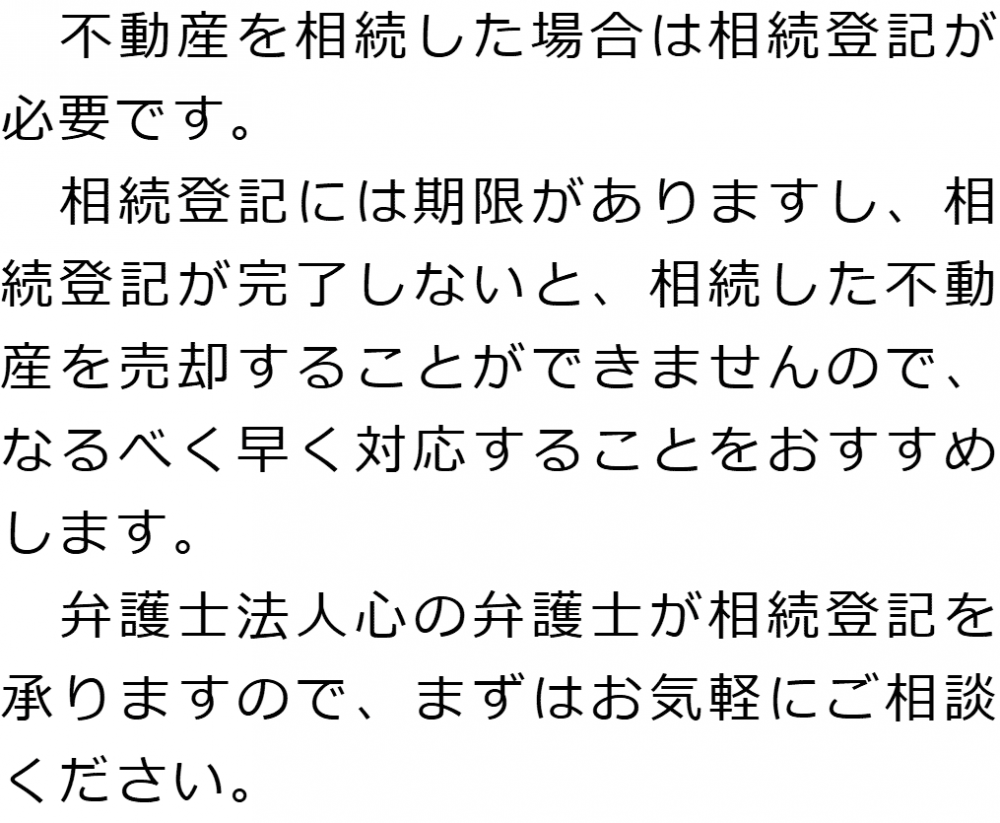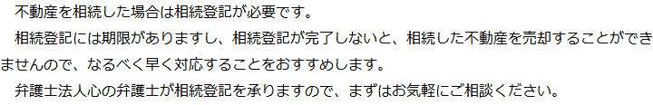 トップ業務内容相続登記 階層構造▼ 業務内容(目次) 相続登記 業務内容(目次)業務内容トップ行政書士法人心の業務内容遺言遺産整理相続人調査相続財産調査遺産分割協議書の作成預金・貯金の解約・名義変更証券口座の解約・名義変更自動車の名義変更心グループのその他の業務内容家族信託・民事信託節税対策事業承継遺言の検認相続放棄限定承認遺産分割遺留分侵害額請求相続登記相続税申告相続税調査 受付時間 平日 9時~21時、土日祝 9時~18時 夜間・土日祝の相談も対応します (要予約) 所在地 〒530-0001 大阪府大阪市北区梅田1-1-3大阪駅前第3ビル30F 0120-2403-39 お問合せ・アクセス・地図