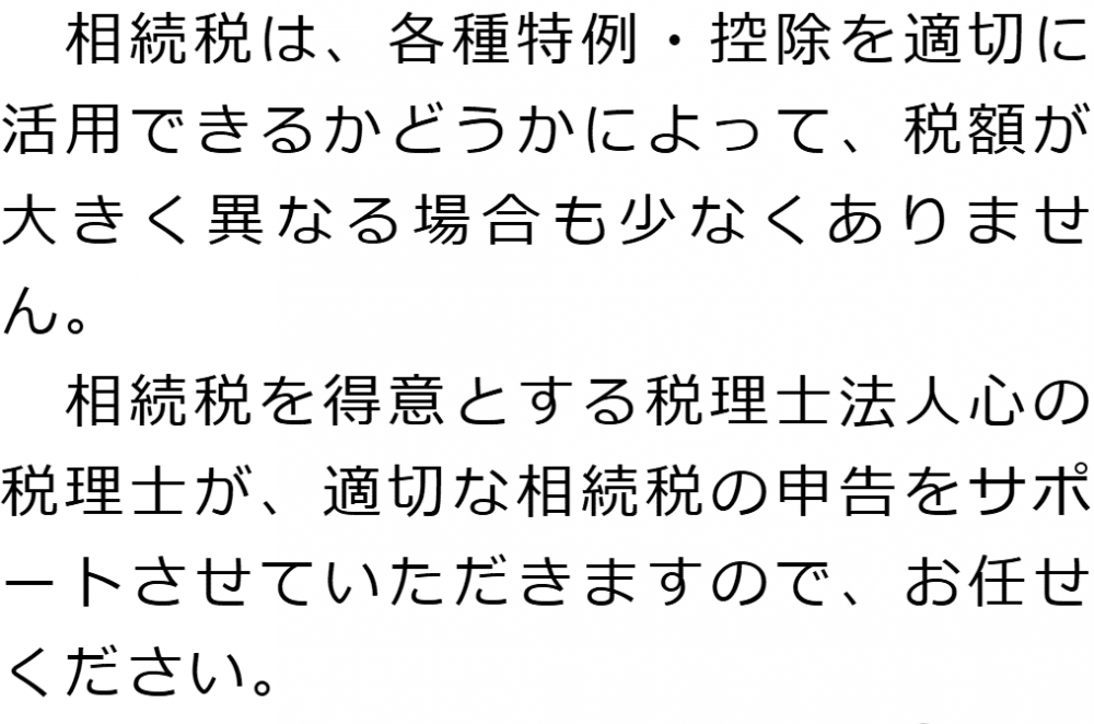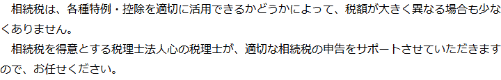 トップ業務内容相続税申告 階層構造▼ 業務内容(目次) 相続税申告 業務内容(目次)業務内容トップ行政書士法人心の業務内容遺言遺産整理相続人調査相続財産調査遺産分割協議書の作成預金・貯金の解約・名義変更証券口座の解約・名義変更自動車の名義変更心グループのその他の業務内容家族信託・民事信託節税対策事業承継遺言の検認相続放棄限定承認遺産分割遺留分侵害額請求相続登記相続税申告相続税調査 受付時間 平日 9時~21時、土日祝 9時~18時 夜間・土日祝の相談も対応します (要予約) 所在地 〒530-0001 大阪府大阪市北区梅田1-1-3大阪駅前第3ビル30F 0120-2403-39 お問合せ・アクセス・地図