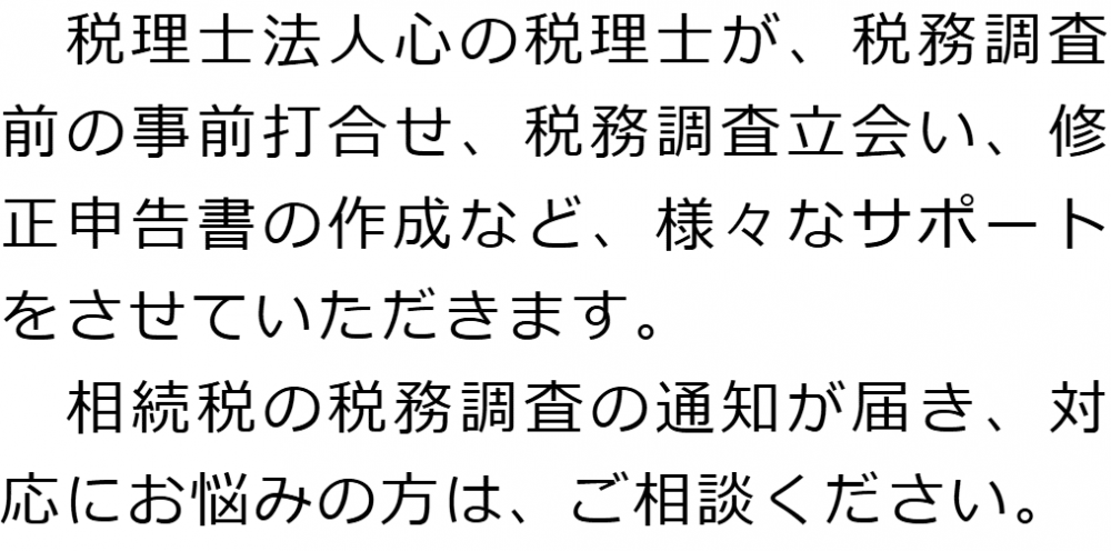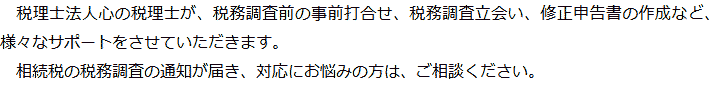 トップ業務内容相続税調査 階層構造▼ 業務内容(目次) 相続税調査 業務内容(目次)業務内容トップ行政書士法人心の業務内容遺言遺産整理相続人調査相続財産調査遺産分割協議書の作成預金・貯金の解約・名義変更証券口座の解約・名義変更自動車の名義変更心グループのその他の業務内容家族信託・民事信託節税対策事業承継遺言の検認相続放棄限定承認遺産分割遺留分侵害額請求相続登記相続税申告相続税調査 受付時間 平日 9時~21時、土日祝 9時~18時 夜間・土日祝の相談も対応します (要予約) 所在地 〒530-0001 大阪府大阪市北区梅田1-1-3大阪駅前第3ビル30F 0120-2403-39 お問合せ・アクセス・地図